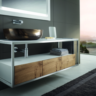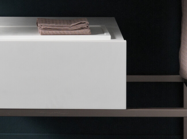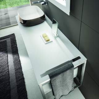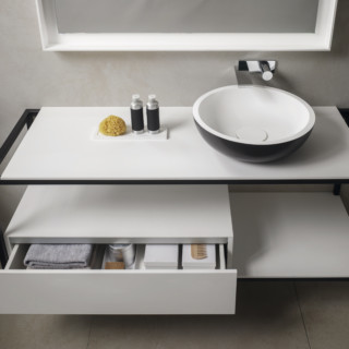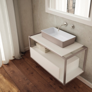 Leggerezza di linee e versatilità. Sintesi è la nuova collezione di BRERA realizzata coniugando la forza dell’acciaio inox con l’essenzialità estetica scelta da BizzarriDesign. La Pietra Acrilica permette a Sintesi di mantenere versatilita? sartoriale delle superfici di appoggio.